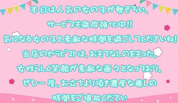 | 待遇 | 歩合制(保障給あり)、全額日払い可シフト自己申告制。その他、何かご要望がございましたらご相談に応じさせていただきます。 |